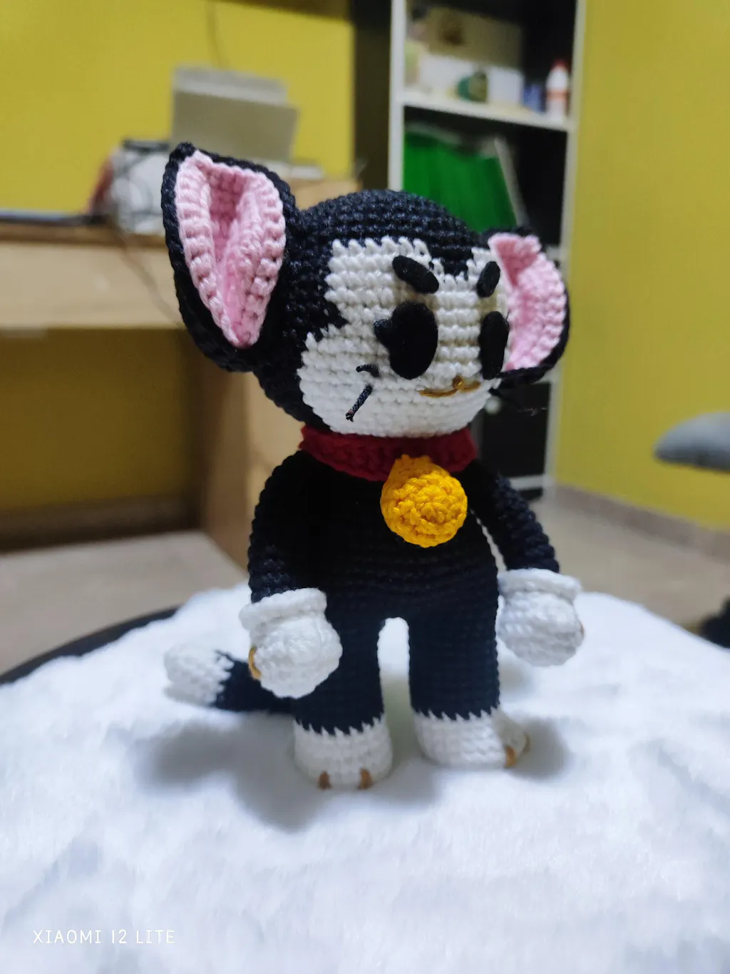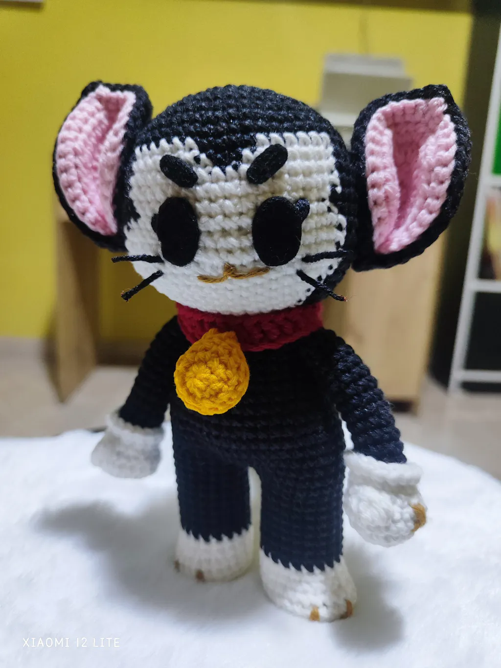 Materiales que vas a necesitar: • Aguja crochet 3mm para una altura de 20cms. • Cualquier lana para ese tipo de aguja, colores: negro, blanco, rosa, rojo y amarillo. • Trozo de hilo marrón y negro. • Fieltro color negro. • Alambre/Limpiapipas. • Aguja lanera. • Relleno sintético. • Silicona. • Tijeras. • Alfileres. • Marcador.
